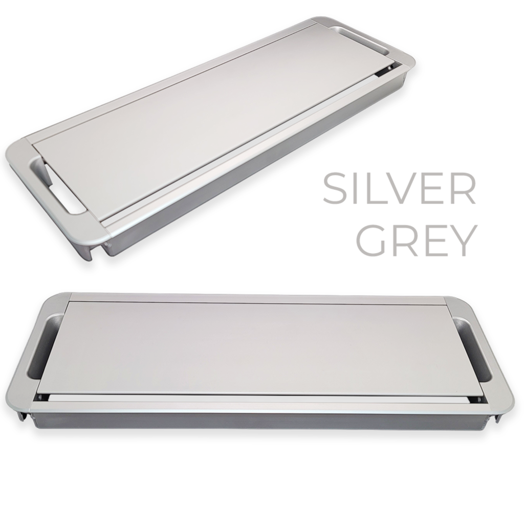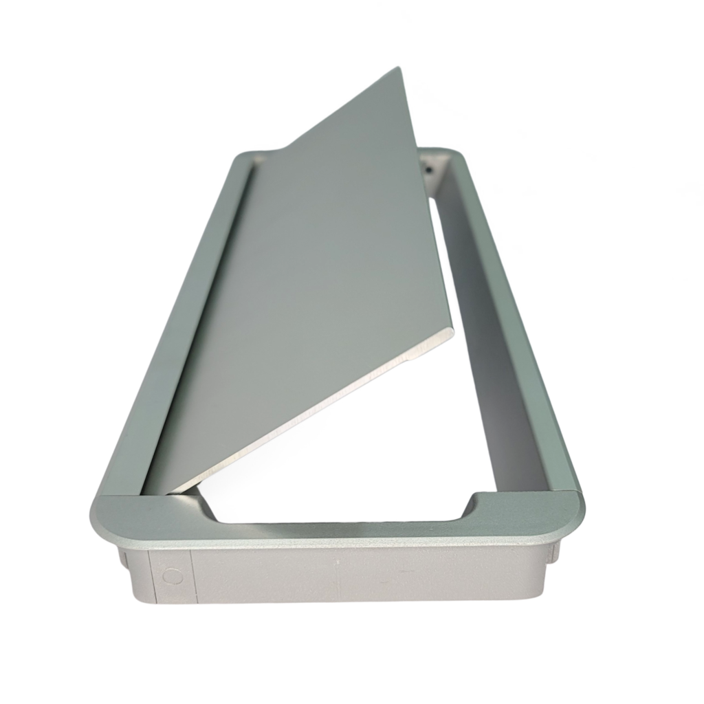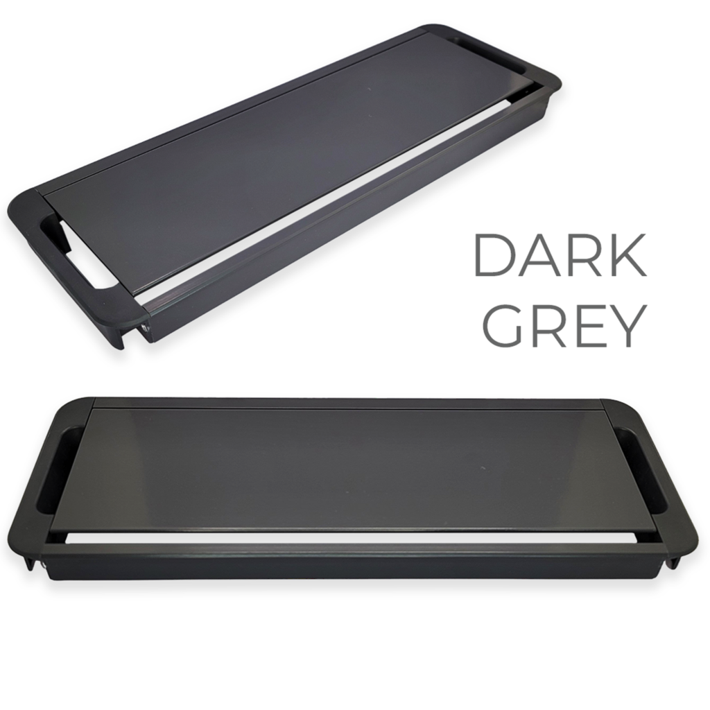 A sleek aluminium flip-up cable access solution for modular office furniture, offering easy power and data access with a clean desk finish, available in Silver Grey, Dark Grey, and White.