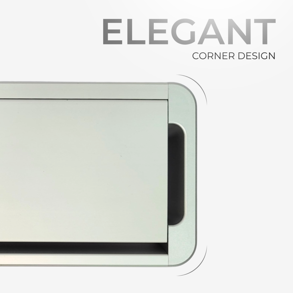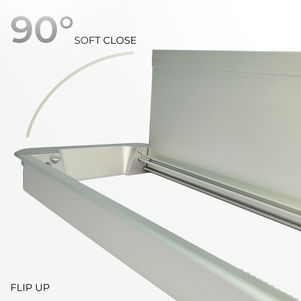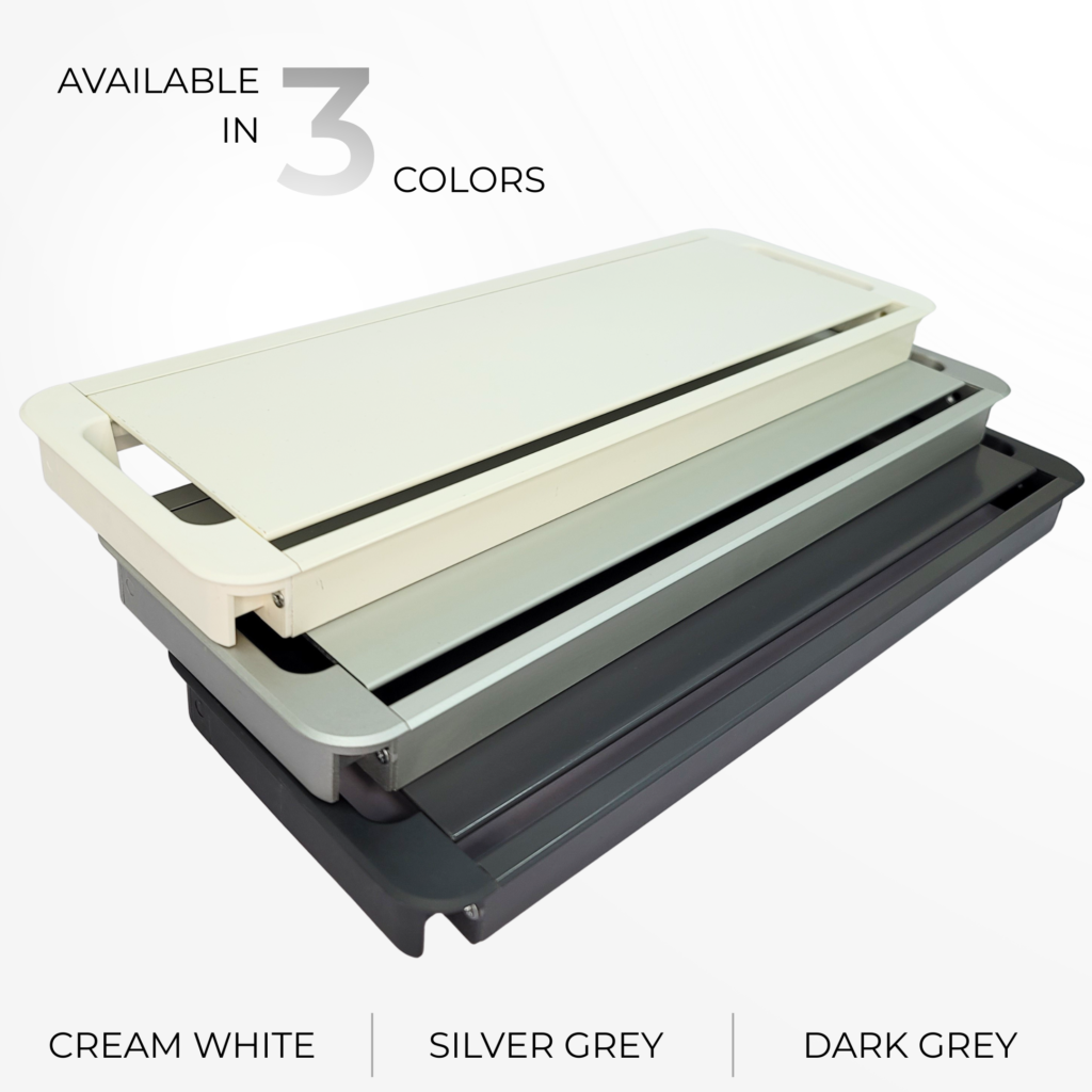 A sleek aluminium flip-up cable access solution for modular office furniture, offering easy power and data access with a clean desk finish, available in Silver Grey, Dark Grey, and White.